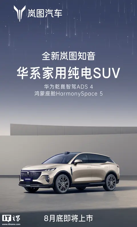 据介绍,全新岚图知音纯电 SUV 将在 8 月底登场(微博原文为“8 月底即将焕新登场”,预热海报为“8 月底即将上市”,具体预售及上市情况以官方最终信息为准),搭载华为乾崑智驾 ADS 4 和鸿蒙座舱 HarmonySpace 5。