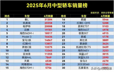 今天为大家分享6月中型轿车零售销量排行榜,乘联会官方数据显示,共有63款车型上榜,比亚迪秦L表现惊人,荣登销冠宝座,丰田凯美瑞(图片|配置|询价)亚军,大众帕萨特成功跻身前三甲,迈腾、海豹06 DM-i都进前五,Model3、红旗H5、奔驰C级、雅阁都位居前十名,反观别克君威却很一般,排名已20名开外。别乱买,2025年6月中型轿车销量榜,秦L夺冠,凯美瑞亚军,君威第21名。