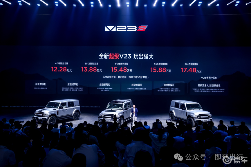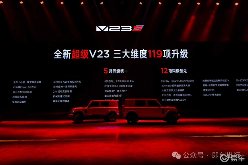 自上市以来,V23凭借极致风格风靡市场,一举成为2025年1-8月新能源方盒子累计销量冠军。此次全新超级V23更进一步,围绕“超级性能、超级操控、超级越野”三个核心维度进行了脱胎换骨的全面进化。