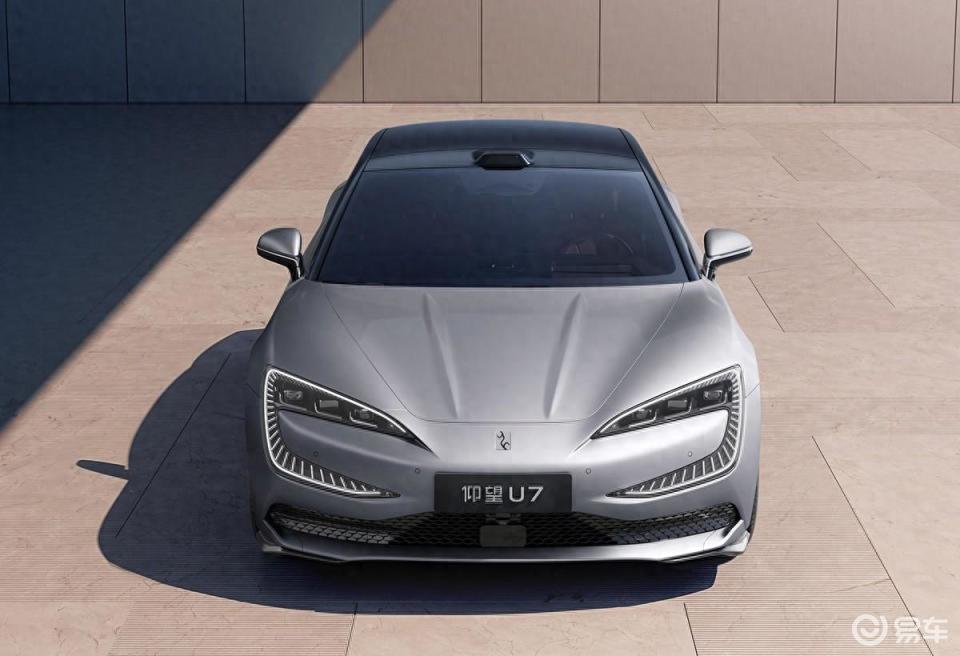 前脸部分,这辆仰望U7的车头造型风格和仰望U9一致,大灯造型很抢眼,使用了C形的轮廓,内部带有矩阵式的光源,C形的灯带带有放射形状的光源,视觉效果很炫酷。前机盖内凹、两侧隆起的造型很动感,机盖中间带有两条隆起的筋线装饰。前脸上部是封闭式设计,前杠底部是横贯式格栅造型,底部是突出的扰流铲造型,两侧还有碳纤维套件装饰。