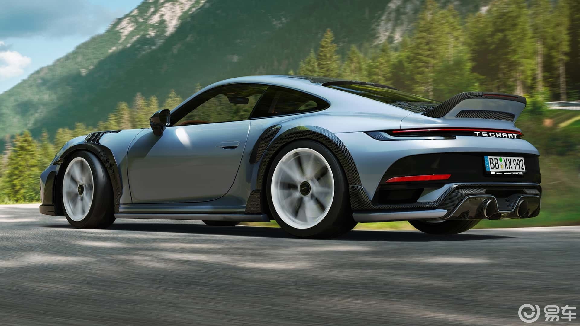 当然,最大的亮点还是那个复古风味十足的尾翼,不仅好看,还能在高速行驶时可以平衡下压力和风阻,并且尾翼本体要比标准版轻了60%,同时有利于让车身后部的双涡轮水平对置六缸机吸入更多冷空气,从而配合Techart的一阶/二阶动力升级。