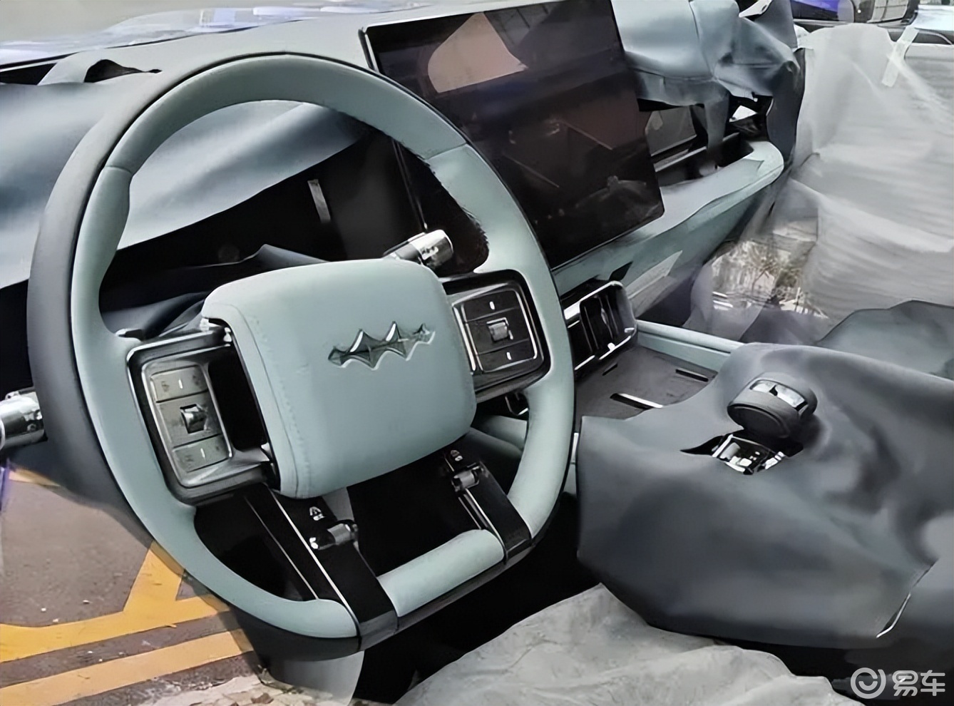从曝光的内饰谍照来看,豹8的内饰也继承了豹5的设计。中控台上,类似前包围的“锁扣”结构也被运用在中控台区域,增加了细节处的硬派感。中控台面由三块显示屏组成,并且整合了出风口细节,并点缀以镀铬饰条装饰。中央扶手区域的布局仿若战斗机的座舱,挡把采用了可升降设计,周围也布局了部分按键。目前车机系统的具体信息尚未公布,但参考DiLink智联系统的一贯表现,不仅确保了车内智能化配置,也保证了车机功能的丰富。