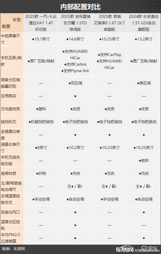 内部配置方面,捷达VA7和艾瑞泽8中控屏尺寸偏小,并且功能相对较少。星瑞东方曜中控屏尺寸在四款车中最大,同时提供了丰富的手机互联/映射功能,还支持应用商店,拓展性更强。其他配置来看,星瑞东方曜和第三代逸动表现相对更好,前者独享温度分区控制,后者则标配了前排手机无线充电功能。相比之下,捷达VA7整体配置水平中规中矩,缺少亮点。