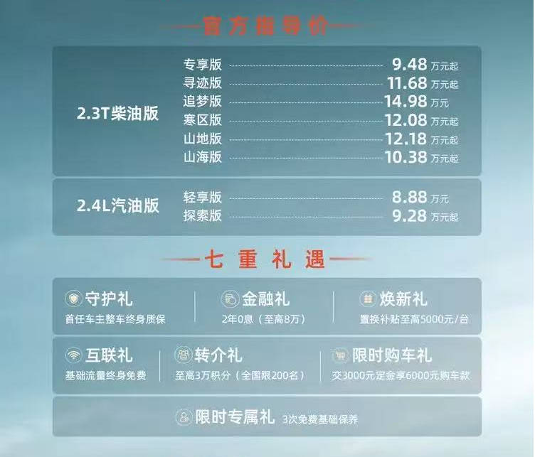 在底盘方面,威麟R08采用加厚钢板,标配5片钢板弹簧,使得承重能力表现更强。威麟R08柴油版本搭载2.3T柴油发动机,最大功率120千瓦,峰值扭矩达到420米,传动系统根据不同车型将提供6挡手动变速箱和8挡手自一体变速箱。汽油版采用2.4L发动机,传动系统配备5挡手动变速箱,最大功率118kW,最大扭矩230N·m。新车离地间隙220mm,最大接近角33°,离去角24°,最大涉水深度600mm,对于负载以及爬坡等工况,能够提供足够的动力储备,能适应大部分路况。