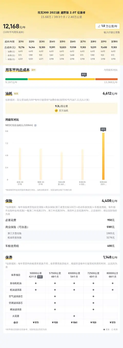 据估算,同级车的最低用车成本是5178元/年,最高是16778元/年,坦克300 2021款 越野版 2.0T 征服者是12188元/年,用车成本较高。