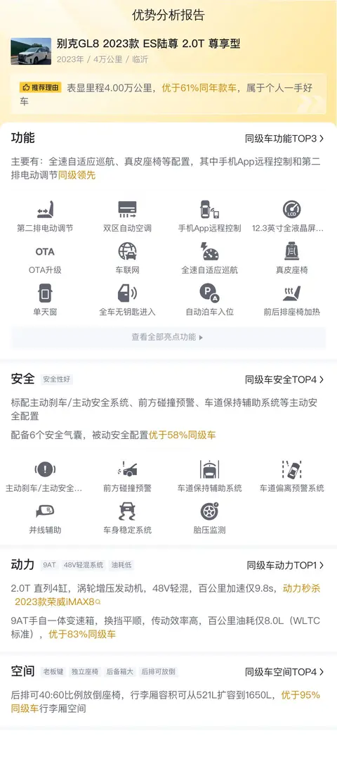 今天为大家带来的这款别克GL8 ES陆尊 2023款 2.0T 尊享型,车源地为临沂,上牌时间为2023年10月,表显里程4万公里,白色车身深色内饰,新车指导价34.39万,二手车报价23.58万,过户次数0次。支持分期购车,首付6.8万即可开回家。