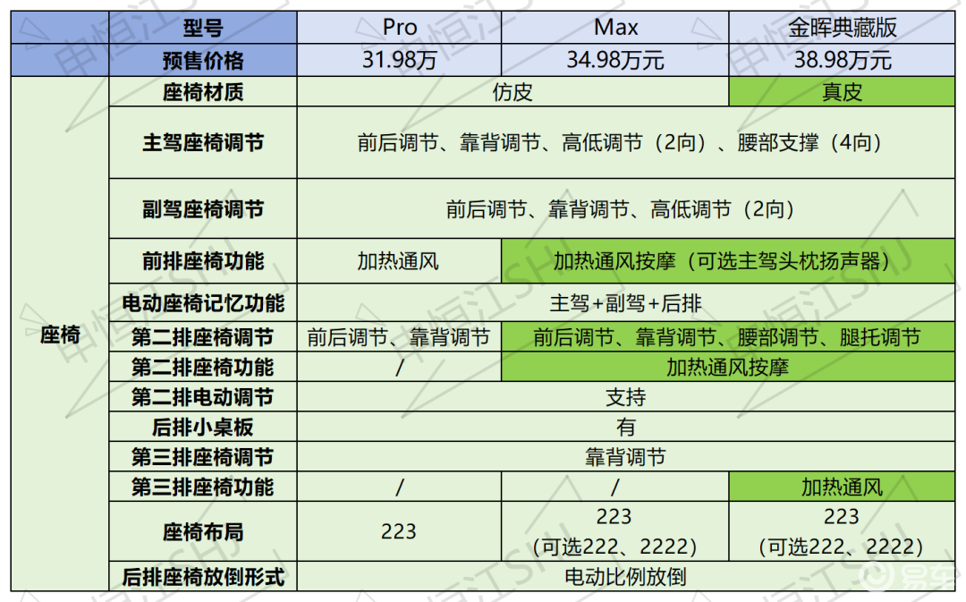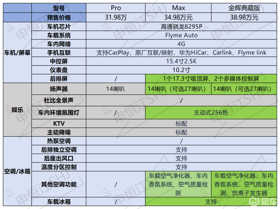 2.扬声器都是14个喇叭,但现在有一个上市全系,中高配直接免费升级为27喇叭。低配没有氛围灯,中高配是主动式256色氛围灯。全系支持主动降噪功能、KTV。