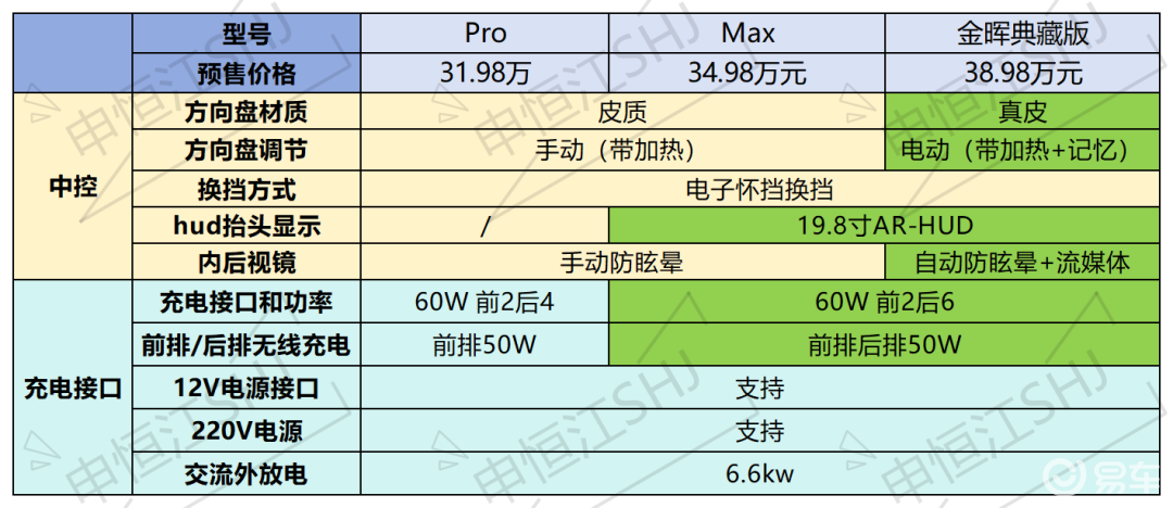 2.中高配相比低配,二排多了两个50瓦无线充电,全系支持220v电源、6.6kw交流外放电。