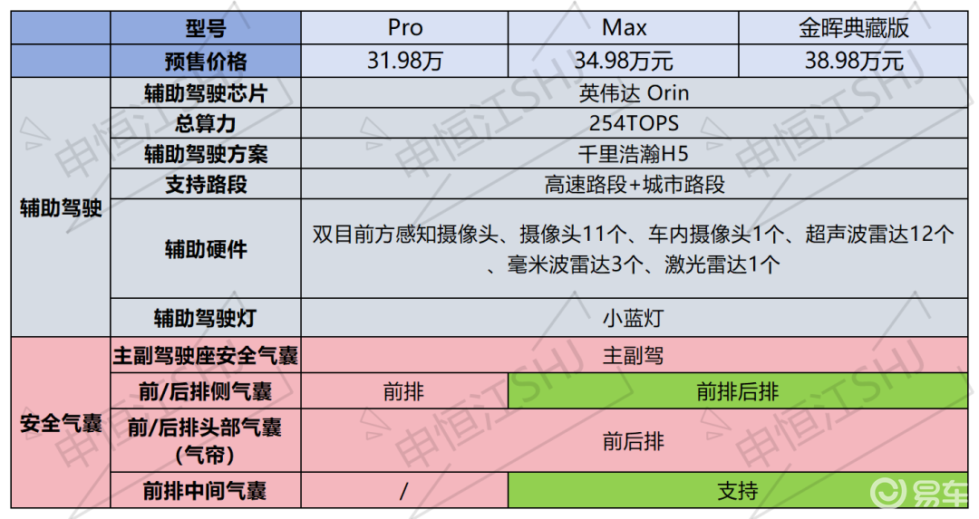 1.智驾:英伟达Orin芯片、254TOPS算力、千里浩瀚H5方案、支持高速路段和城市路段,带有一个激光雷达,带有智驾小蓝灯。