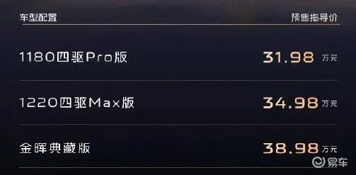 银河V900有三个配置,都是双电机四驱,预售价分别是31.98万元、34.98万元、38.98万元。正式上市估计会降低5000-10000元。