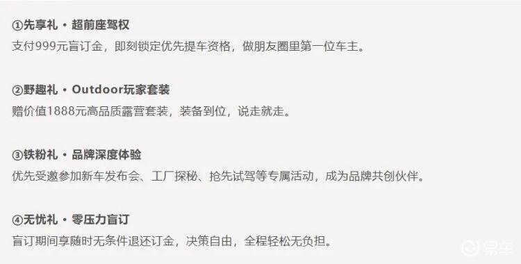 对于订车用户,可享受四重福利,包括优先提车、赠送价值1888元露营套装、优先受邀参加车企活动/共创伙伴、盲订期间订金随时可退,具体看下图。