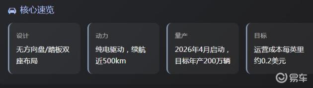 Cybercab定下了年产200万的目标,一开始会觉得这有一些异想天开,但真正的了解到开箱工艺之后,才发现这才是真正的制造革命。传统的汽车在制造时都只能够按照循序渐进的原则,而这一种开箱工艺就会把车身拆成四大模块,然后又重新拼装整合在一起,就好像是拼乐高一样。因此效率是比较高的,目标就是下线一台车只需要5秒,要比Model Y产线快了7倍,这在汽车制造史上是前所未有的。为了能够实现这一个目标,特斯拉在工艺还有成本上就做了精简,结构件从Model Y的200个减少到80个。靠的都是前后一体压铸技术。取消涂装车间,塑料件涂塑时直接上色,只给钢材喷漆,再加上砍掉所有的驾驶控制零件,单车制造的成本就能有效压低到大约17.3万元,目标的售价估计都不会超过3万美元。