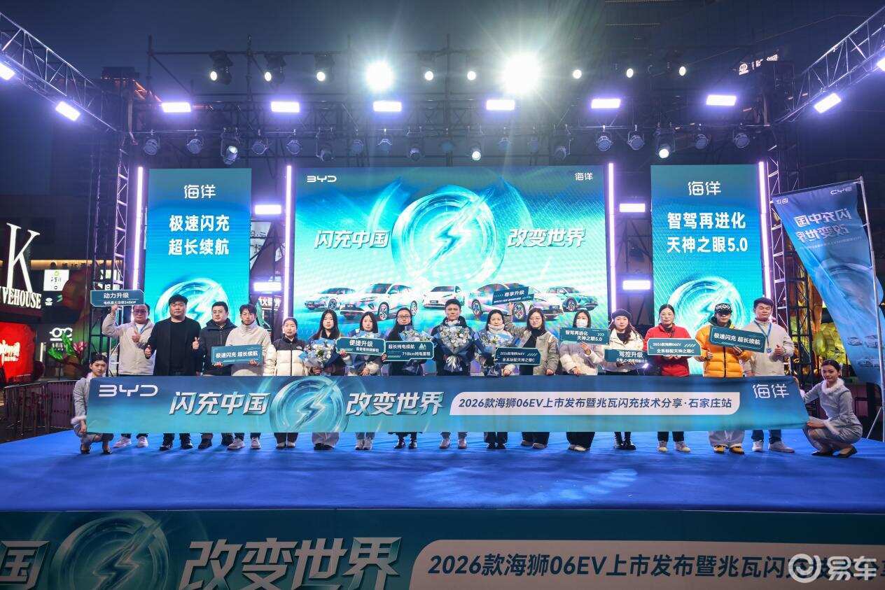 3月6日晚,“闪充中国 改变世界” 2026款比亚迪海狮06EV上市发布暨闪充技术发布会在石家庄盛大启幕。比亚迪海洋网主要领导、石家庄主流汽车媒体、准车主朋友们齐聚一堂,共同见证这款重磅纯电车型的惊艳亮相,以及闪充技术的正式发布,携手开启石家庄纯电出行的闪充新时代。