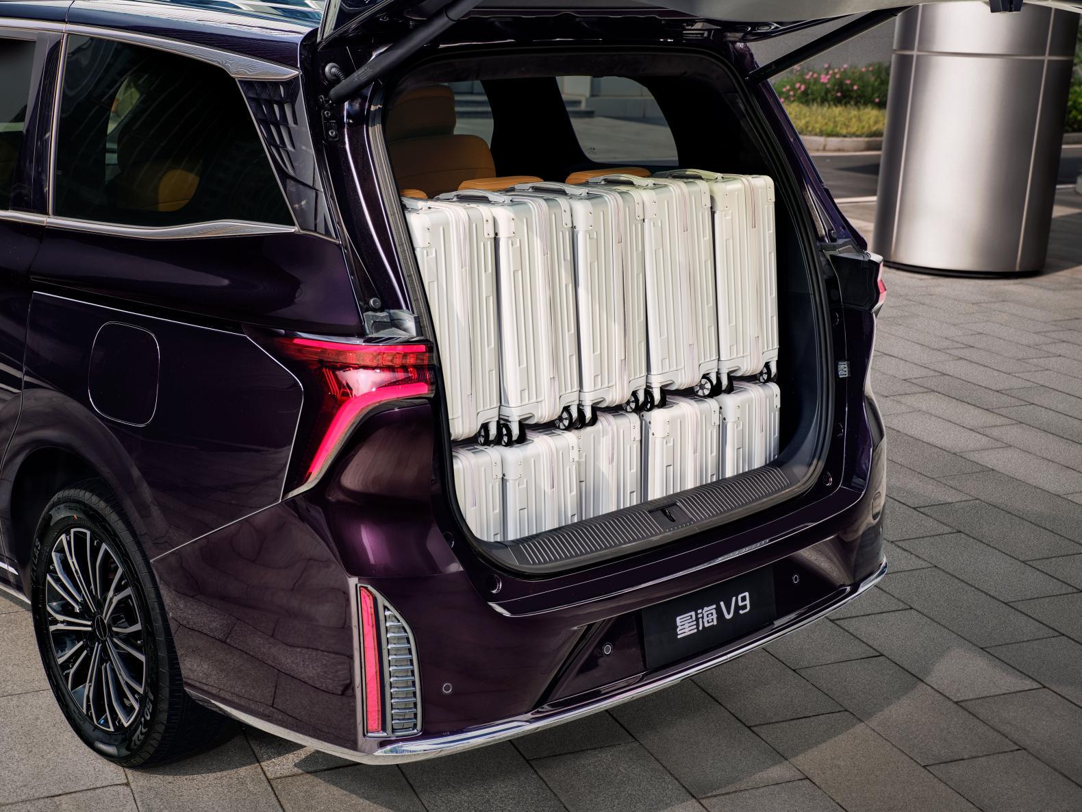 星海V9作为同级唯一搭载第三排4/6分下沉式放平设计的车型,常规后备箱容积达593L,满载7人时,仍能轻松容纳7个20寸行李箱+7个背包。当需要装载更多装备时,第三排下沉放平后,后备箱容积可拓展至2616L,还能形成1.7m纯平空间,临时休息、放置大件物品都十分便捷,完美适配春季露营等多场景需求。